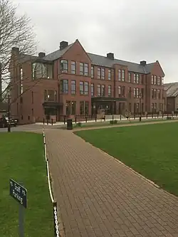 The school's building of greatest architectural merit is the Grade II* listed Chapel House.[93] The architectural historian John Newman describes the 18th-century building, situated on the Hereford Road away from the main school site, as "the best house in the entire street".[94] More modern developments include the Hall of 1961, redeveloped in the early 21st century and now the Blake Theatre,[95] the Red Lion Block of the same date and the Science Block of 1981–1984.[76] In 1985–1986, two ceramic murals were designed for the chapel by the Polish religious artist Adam Kossowski, a friend and wartime colleague of the school's Head of Art from 1947 to 1978, Otto Maciag (1918–2000). Executed by Maciag, and another art master at the school, Michael Tovey,[96] the murals were dedicated at a service conducted by the Bishop of Monmouth, the Rt Rev Clifford Wright on 3 October 1987.[97] He described them as "masterpieces of twentieth-century religious art".[98] In November 2008, a £2.3 million sports pavilion was completed[99] and opened by the former British Lions player and Welsh captain, Eddie Butler, an old boy of the School.[100] It was designed by the architects Buttress Fuller Alsop Williams.[100] In 2011, the school began the Heart Project.[99] This led to the sale of some outlying sites, such as St. James's House, and the re-organisation of others, to assist in the raising of funds for the redevelopment of the main school site.[95] Further funds came from the Haberdashers' Company, and the first phase was completed with the rebuilding of the Red Lion Block, renamed the William Jones Building.[99]
