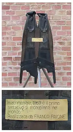 1969: Franco Pavone[9] constructs his "Matrimoniale" monofin in the Italian city of Bologna. After designing a high-speed monofin with a metal-reinforced rubber blade, Boris Porotov[10] (Kazakh Soviet Socialist Republic) builds an entire blade out of fibreglass-reinforced plastic.[11][12]