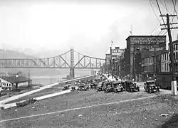 The Monogahela Wharf was the commercial hub for the city of Pittsburgh.[3] One of the first bridges in Pittsburgh, the Wabash Bridge, later part of the Pittsburgh and West Virginia Railway, was built near the Wharf in the early 20th century.[3]