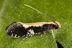 The adults of this small moth have a wingspan of 13–20 mm. On the wing around May to October (depending on the location), they are nocturnal but may fly around in daytime or be attracted to light occasionally. They have blackish forewings with a thick creamy-white trailing edge, some sprinkles of the same color along the leading edge, and the translucent center spot characteristic for the genus Monopis. The hindwings are a lighter greyish brown with minute black speckles; they are surrounded by a long-haired fringe, as usual for fungus moths and relatives. The body is dark brown, and the head bears a tuft of creamy-brown hair.[3][4] This species can easily be mistaken for Monopis crocicapitella due to almost indistinguishable markings.[5][6]