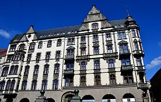 The hotel was built in 1900 in the eclectic style with elements of Art Nouveau and Gothic Revival architecture on the site of former Cafe Central. It was designed by architect Ludwik Goldstein and officially opened in 1902. It quickly became one of the most representational hotels in the city.[2] Its first owner was Arnold Lustig.[3]