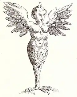 The earliest account of the monster's existence is from the diarist Sebastiano di Branca Tedallini, who recorded on March 8 that news of a strange infant's birth had reached Pope Julius II in Rome. According to his account, the child was said to have been born of a nun and a friar, and was marked by a horned head, the letters YXV on its chest, and with one leg hairy and cloven-hoofed while the other leg's midsection grew a human eye.[1] On March 11, the apothecary Luca Landucci documented how word of this incident had reached Florence; having apparently received a drawing of the monster, Landucci described it to possess features such as a single horn, the wings of a bat, hermaphroditic genitalia, an eye on its right knee and a clawed left foot like an eagle's.[2][3][4] The tale was subsequently immortalized by further chroniclers of the era, including Johannes Multivallis, Jacques Rueff, Conrad Lycosthenes, Caspar Hedio, Pierre Boaistuau, Fortunio Liceti, and Ambroise Paré.[5] Landucci's physical description seems to have been considered authoritative, as later chroniclers, particularly Boaistuau, largely reproduced his account word-for-word.[6][a]