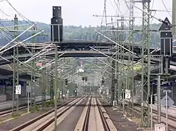 Five tracks are available for passenger transport. Next to track 1 and between tracks 4 and 5, there are two 405 m long and 76 cm high platforms,[7] which both have a 200-metre-long section under cover.[5] The platform face on track 5 is divided into platform 5a to the west and 5b to the east, with mid-platform exit tracks that cross, permitting trains to run in both directions.[1] Track 5 is used exclusively by regional trains and tracks 1–4 are only used by ICEs. Tracks 2 and 3 are the main tracks used by non-stopping trains on the high-speed line. In addition, there are seven tracks available for freight.