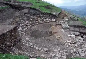 Archaeological evidence suggests that an indigenous settlement was present at Montagna dei Cavalli from the 9th century BC. The settlement was certainly flourishing between the 7th and 6th centuries BC and was probably inhabited by Sicans[7][8] attracted by the favourable setting, with clear defensive capabilities, conditions suitable for agriculture and pastoralism, and several sources of water. The first village probably developed on the highest part of the mountain and along its flanks. The few archaeological discoveries from this phase are a scatter of local ceramics, found in most parts of the settlement.[9] The Sican communities reacted to the foundation of the Greek colonies on the coast (Himera, Selinus, and Acragas) by consolidating ever more in the interior. Cultural and economic links between the various communities developed, which very likely allowed the settlement to flourish in the first decades of the 5th century BC. Such relationships are attested at Montagna dei Cavalli by the discovery of vases imported from the Greek colonies, datable to the first half of the 6th century BC. Alongside the Greek products, indigenous ceramics also circulated, characterised by painted or incised geometric decoration.[9]