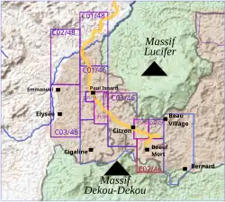 The Paul-Isnard mining concessions, which include the “Montagne d'Or” site, are located in the commune of Saint-Laurent-du-Maroni, in the French overseas department of Guyana. They are located south of the town of Saint-Laurent-du-Maroni, to which they are linked by a 120 km forest track, passing through the Apatou Crossroads. They are located 180 km west of Cayenne. They belong to the basin of the Mana River which has its mouth near the estuary of the Maroni River, between the villages of Awala-Yalimapo and Mana. The Montagne d'Or site is located in an area where mining is authorized, under certain conditions, between the two parts of the Lucifer Dékou-Dékou Biological Reserve, with the Dékou-Dékou Massif to the south, and the Lucifer Massif to the north, both of which are areas in which mining is prohibited.[3]