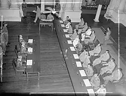 Stopford took over as Commandant from Major General Robert Collins, who ironically had been one of his instructors there when he was attending as a student in the 1920s.[2] The course at the Staff College, Camberley (and also the Staff College, Quetta in India for Indian Army officers) had, before the war, lasted almost two years and the intention was to teach the students to not only be excellent staff officers but, essentially, to prepare them to be the generals of the future. The outbreak of war, and the necessity to provide large numbers of competent and qualified staff officers in the quickest time possible, had resulted in the course being considerably reduced from nearly two years to five months, and the pre-war competitive entrance exam was abolished. Stopford, promoted to temporary major general in January 1942,[23] was there for just over a year, where many important lessons were learnt from the fighting in North Africa, until, in November 1942 Stopford handed over to Major General Sir Alan Cunningham.[18]