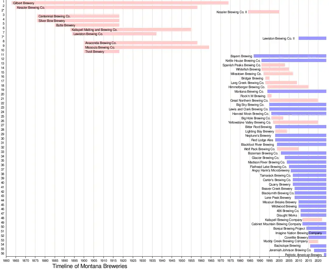 - 1863 - "Gilbert Brewery" was founded by Henry Gilbert, Christian Ritcher, and William Smith, making it one of the Montana Territory's first breweries, though it was not the first.[9] Originally called "Thorn-Smith Brewery" and then "Virginia Brewery", the brewery continued until Montana Prohibition laws went into effect around 1916–1918. The brewery re-opened in 1934 but closed for good in 1974.[10]