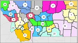 The 1889 state constitution provided for dividing the state into seven judicial districts.[31] Article VII, Section 6 of the 1972 constitution permitted the state legislature to determine the number of judicial districts, with the proviso that each district be composed only of whole counties, and that each county in the district be adjacent. The article also permitted the Chief Justice of the Montana Supreme Court to assign District Court and other judges to temporary service in another judicial district or in another county. The state has maintained the number of courts at 56 and the number of judicial districts at 22 for some decades.[32][33]