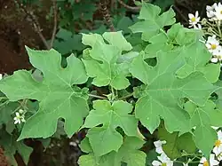 It is an erect, tree-like, perennial shrub that is 2 to 7 m (7 to 23 ft) tall.[2][3] Leaf arrangement is simple and their form is opposite. They are pinnatifid when young, and palmately lobed during maturity. The leaves are up to 25 cm (10 in) in length and width, dark green above and paler below, and smoothly hairy on both surfaces, with a pair of lobes at the base of the leaf blade.[4]