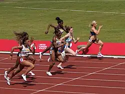 Douglas represented Great Britain at the 2008 Olympics, in the 100 metres. In her first round heat, she placed second behind Ivet Lalova in a time of 11.36 to advance to the second round. There she failed to qualify for the semi-finals as her time of 11.38 was only the fourth fastest time of her heat.[5] She was also part of the Great Britain team which reached the final of the 4x100 metres relay, and which (along with the Jamaican team) were favourites to claim a medal. Jeanette Kwakye ran a good first bend in the final, but the British team failed to finish due to a mix-up in the changeover between Douglas and Emily Freeman. Jamaica also failed to finish after a similar error between Sherone Simpson and Kerron Stewart.[6]