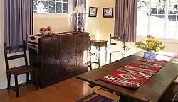 Monterey Furniture refers to several furniture lines made from 1930 to the mid-1940s in California. Uniquely western, the line derived its character from Spanish and Dutch Colonial styles, California Mission architecture and furnishings, ranch furnishings, and cowboy accoutrements such as might be found in a barn (lariats and branding irons). Mason Manufacturing Company, founded by Frank Mason and his son, George, are credited with the original style of its time.[1] Other lines were made by Imperial Company, Angeles Furniture Company (the line called Coronado), Del Rey, Brown and Saltman, but even Sears (La Fiesta) and Stickley created Monterey-style furniture.[2]