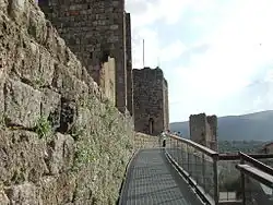 The roughly circular walls, totalling a length of about 570 metres (1,870 ft) and following the natural contours of the hill, were built between 1213 and 1219. There are 14 towers on square bases set at equidistance, and two portals or gates. One gate, the Porta Fiorentina opens toward Florence to the north, and the other, the Porta Romana, faces Rome to the south. The main street within the walls connects the two gates in a roughly straight line.