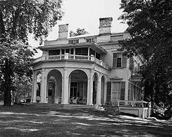 Janet's descendants called on Downing's friend Alexander Jackson Davis to expand and renovate the house into a more classically inspired villa over a period of 20 years. He used curved forms in the balustrades and wings to offset the strong vertical lines of the existing building. The arcaded pavilion makes the veranda common on many mid-19th century houses into a wing of its own. Textures were added to the surface in the abundant decorations, many using floral motifs. All these features link the house more firmly to its surrounding landscape. Davis scholar Jane Davies calls it his finest country house.[7]