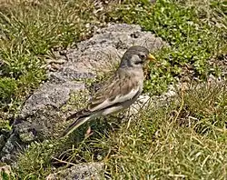 Most snowfinches breed above altitudes of 3,500 metres (11,500 ft), but the white-winged snowfinch can occur from 1,800 metres (5,900 ft) upwards. These hardy birds inhabit bare open mountain grassland. Snowfinches are not migratory but may move to lower altitudes or human habitation in winter, when these highly gregarious birds form large flocks. Snowfinches are primarily ground-feeding seed-eaters, though they also consume small arthropods, especially when breeding. They are typically fearless, and will forage around ski resorts, human habitation and rubbish tips.[3]