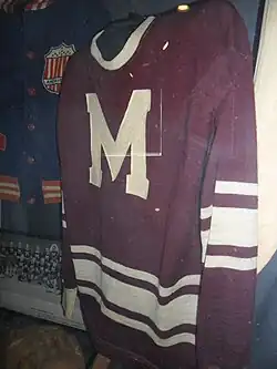 At the time of their founding, the Maroons had no nickname. The Maroons' president, James Strachan, had been the owner of the Wanderers in the 1900s. He attempted to secure the Wanderers name, but negotiations failed (Wanderers' last owner Sam Lichtenhein wanted CA$5,000 (equivalent to about $87,278 in 2023)[10]), so the club was known by its official name, the Montreal Professional Hockey Club.[11] With the team introducing maroon-coloured sweaters complete with a large capital letter "M" for a logo (the letter officially stood for their home city, not the colour), the "Maroons" nickname was picked up by the media. The club never officially changed the organizational name to incorporate the Maroons name.