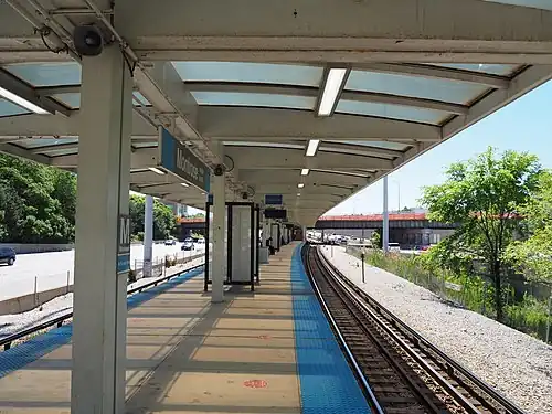 Montrose is a station on the Chicago Transit Authority's 'L' system, serving the Blue Line. The station serves the Irving Park, Mayfair, and Portage Park neighborhoods. Blue Line trains run at intervals of 2–7 minutes during rush hour, and take 22 minutes to travel to the Loop. The station is located in the median of the Kennedy Expressway. The station opened in 1970 as part of the Kennedy extension, connecting the Milwaukee Elevated from Logan Square to Jefferson Park.