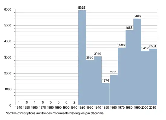 The following graphs summarize the number of classification and registration as historical monuments by decade, since 1840.
