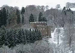 The building may have incorporated an earlier fortalice as there are garderobes in the walls of the west wing.[4] The estate was sold to Colin Campbell of Lagvinshoch in 1666 and passed from him to his son Patrick Campbell, Lord Monzie. His descendant, General Alexander Campbell, MP, enlarged the house by adding a much larger castellated building on its east side in 1797–1800 that was designed by John Patterson. The house was inherited by Charles Maitland-Makgill-Crichton in 1900. The interior of the addition was gutted by a fire in 1908 and rebuilt by Sir Robert Lorimer over the next four years in his own style.[5]