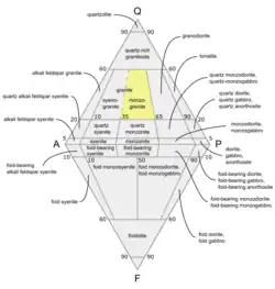 Monzogranite is a plutonic rock that occupies the middle of the QAPF diagram, consisting of between 20–60% quartz, and of the remainder, between 35–65% alkali feldspar and the remainder plagioclase.
