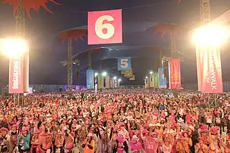 The MoonWalk is a night-time charity event organised by UK based grant-making breast cancer charity, Walk the Walk. Women and men power walk either a marathon (“Full Moon”) or half-marathon (“Half Moon”), wearing brightly decorated bras to raise money for breast cancer causes. The event is held annually in London, Edinburgh and Iceland.