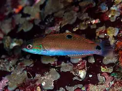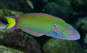 The moon wrasse (Thalassoma lunare)[2] also known as the crescent wrasse or lyretail wrasse, is a species of wrasse native to the Indian Ocean and the western Pacific Ocean. It is an inhabitant of coral reefs and surrounding areas at depths from 1 to 20 m (3.3 to 65.6 ft). Moon wrasses are carnivorous and tend to prey on fish eggs and small sea-floor dwelling invertebrates. This species can reach 45 cm (18 in) in total length. It is of minor importance to local commercial fisheries and can also be found in the aquarium trade.[3]