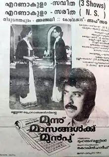 Moonnu Masangalku Mumbu (transl. Three months ago) is a 1986 Indian Malayalam-language courtroom drama film, directed by Cochin Haneefa and produced by Muhammed Mannil. The film stars Mammootty, Urvashi, Nedumudi Venu and Ambika. It was remade in Tamil as Paasa Paravaigal[1] and in Telugu as Anna Chellelu.