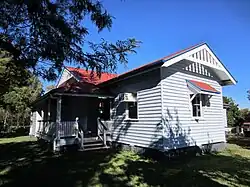 The Sectional School building at Moorooka was aligned approximately east–west, being lowset at the east end, and highset at the west end (due to sloping ground), and consisted of five classrooms 21 by 18 feet (6.4 by 5.5 m), with an 8-foot (2.4 m) northern verandah which wrapped around the east and west sides. A teachers room projected off the northern verandah, and the northeast and northwest verandah corners were enclosed.[20][21] The 1928 plan indicated possible future expansion through the addition of buildings off each corner of the first building, linked by their verandahs;[22] an expansion approach that accommodated the sloping site. The building (known as Block B in 2015) had a Dutch-gabled roof and was set on concrete piers. About two thirds of the understorey play area, on the west side, was floored with concrete. Three of the classrooms were linked by folding partitions, which could be opened to create an assembly hall. The remaining partitions were fixed, with centred doorways.[21] It was reported that there was room for 200 pupils, with ample light and ventilation provided by large windows on the southern side. The completed cost was £2,607.[23][1]