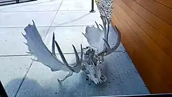 The male's antlers grow as cylindrical beams projecting on each side of the head at right angles to the midline of the skull, and then fork. The lower prong of this fork may be either simple, or divided into two or three tines, with some flattening. Most moose have antlers that are broad and palmate (flat) with tines (points) along the outer edge.[21] Within the ecologic range of the moose in Europe, northern populations display the palmate pattern of antlers, while the antlers of European moose residing the southerly portion of its range are typically of the cervina dendritic pattern and comparatively small, perhaps due to evolutionary pressures of hunting by humans, who prize the large palmate antlers. European moose with antlers intermediate between the palmate and the dendritic form are found in the middle of the north-south range.[23] Moose with antlers have more acute hearing than those without antlers; a study of trophy antlers using a microphone found that the palmate antler acts as a parabolic reflector, amplifying sound at the moose's ear.[24]