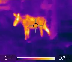 Thermal image of a cow moose in the winter. Her thick, coarse fur with hollow hairs only measures an average of 8.3 °C (15 °F) above the ambient temperature of −23 °C (−9 °F), showing low heat-loss.