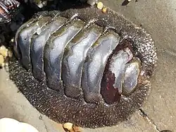 Mopalia hindsii is a species of medium-sized chiton that grows up to 7 cm long. Most commonly found in intertidal zones, M. hindsii has a white ventral side unlike most intertidal chitons that are orange underneath.