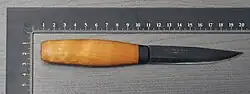 A mora knife (Swedish: Morakniv) is a small sheath knife. It is a fixed blade knife, with or without a finger guard. The term originates from knives manufactured by the cutleries in Mora, Dalarna, Sweden.[1] In Sweden and Finland, Mora knives are extensively used in construction and in industry as general-purpose tools. Mora knives are also used by all Scandinavian armies as an everyday knife.[2]