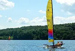 All boats up to 20 horsepower (15 kW) are permitted on Lake Arthur. All powered boats are prohibited in the Game Propagation Area. Sailing is an especially popular activity. Races and regattas are held over the course of the summers. Sailboats, rowboats, kayaks, motorboats, canoes, and pontoon boats are available to rent in the Crescent Bay Area. There are two fueling points for power boats. Tenants pay to keep boats at the park's two marinas. Davis Hollow houses both pontoons and sailboats, while Watts Bay houses sailboats and catamarans. Both marinas are on the North Shore. All boats must have a current registration from any state or a launch permit from the Pennsylvania Fish and Boat Commission. The lake is open to ice boating during the winter months. Ice boats must display a state park launch permit.[3]