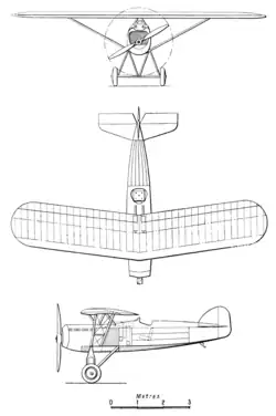 The landing gear conformed with the typical conventions of the company, such as its use of a pair of independent half-axles.[5] The struts of the landing gear were directly attached to the lower longerons of the fuselage via special pivoting joints that eliminated the danger of breaking one of the longerons if one of the struts were to buckle during a hard landing. The shock absorbers, which were located in the plane of the lateral V-shaped struts, consisted of a certain number of independent rubber loops that could be easily replaced; the entirety was fully enclosed within the covering of the front struts.[6] To facilitate ground manoeuvring, the pilot was able to control the orientation of the tail skid in a manner that was independent of the rudder. It was attached to the fuselage by two bolts.[7]