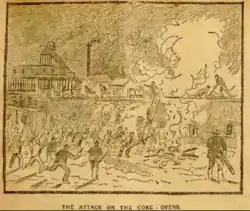 In 1890, the United Mine Workers of America (UMWA) submitted demands to the coke operators that included an eight-hour workday, wage increases, restrictions on house rent, and the right to union-only employment. However, a downturn in the coke industry in 1890 led to the temporary closure of about 20% of Frick's operations. By early 1891, when production resumed, miners found that they were to be paid based on a sliding wage scale tied to coke prices, a change that many felt was unjust. Tensions mounted as operators hired replacement workers and evicted striking miners and their families from company housing. The Morewood strike began on February 10, 1891, when miners in the region, supported by the UMWA, stopped work in protest of pay and working conditions. Tensions rose as workers and their families were evicted from company-owned housing, and Frick, known for his tough stance against unions, resisted their demands. By March, unrest had intensified, and on March 30, a group of about a thousand strikers, some accompanied by a brass band, marched on the Morewood company town.[4]