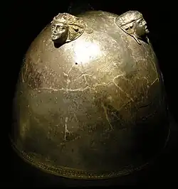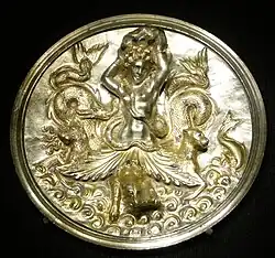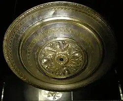 The Morgantina treasure is a set of 16 pieces of Greek silverware with details in gold dating from the 3rd century BC, illegally excavated from Morgantina, an ancient Greek city in Sicily, near modern Aidone. The hoard includes two large bowls, a cup with two handles, plates and several drinking utensils. It was probably excavated around 1978 (the date of a modern coin found buried at the most likely site), and was bought by the Metropolitan Museum of Art in New York in 1981 and 1982. After protracted pressure, in 2010, the treasure was transferred from the Metropolitan to Rome, before returning to Sicily.[1][2]