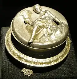 - Pyxis (diameter 10.5 cm, weight 81 g) with a depiction of Eirene holding a cornucopia and a little Eros or Plutus;