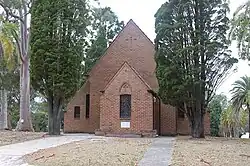 A cemetery formerly associated with the Hospital is off Nentoura Road, Morisset on an isolated bushland site. Its Anglican section has a lych gate and the oldest headstone is dated 1911. The cemetery has been managed by Lake Macquarie City Council since c. 1974. Older sections of the cemetery are set aside in General, Catholic, Anglican, and Uniting (Presbyterian/Methodist) rows. There are many unmarked graves of patients from the Morisset Hospital buried throughout the eastern side of the cemetery.[6] This cemetery has a Memorial Wall, made of grey granite with a large black granite memorial plaque with a dedication to the former Morisset Hospital patients who are buried in unmarked graves in the cemetery. It also has spaces available for filling on either side for families wishing to memorialise their relatives individually.[7][1]