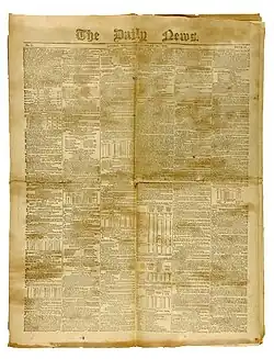 The News was founded in 1846 by Charles Dickens, who also served as the newspaper's first editor. It was conceived as a radical rival to the right-wing Morning Chronicle. The paper was not at first a commercial success. Dickens edited 17 issues before handing over the editorship to his friend John Forster, who had more experience in journalism than Dickens. Forster ran the paper until 1870.[2] Charles Mackay, Harriet Martineau, George Bernard Shaw, H. G. Wells, G. K. Chesterton and Ferdinando Petruccelli della Gattina were among the leading reformist writers who wrote for the paper during its heyday. In 1870, the News absorbed the Morning Star.[3] In 1876, The Daily News and its correspondents Edwin Pears and (later) Januarius MacGahan sounded the first alarm respecting the Turkish atrocities in Bulgaria.[4][5]