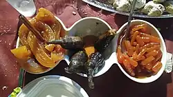 During events and holidays, the housewife often served fruit preserves and sugared fruits, which were used to preserve seasonal fruits year-round. These included jams made from oranges, grapefruits, grapes, apricots, dates, figs, and sometimes even slightly sweet vegetables, such as eggplants, turnips, tomatoes, carrots, and pumpkins.[2] The vegetable-based jams were considered a craft and were served in crystal bowls alongside glasses of water, primarily on special occasions and during Mimouna.[2][4]