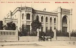 The Morozovs bought the land on Spiridonovka Street in 1893; the mansion was completed by 1898, and Mikhail Vrubel was invited to decorate the interiors.[3] After the death of Savva Morozov, Zinaida Morozova sold the estate to industrialist and philanthropist Mikhail Ryabushinsky, who was forced to emigrate in 1918. After the 1917 October Revolution, the state took over ownership of the mansion, and the building was transferred to the department of the People's Commissariat of Foreign Affairs, and later converted into the Reception House of the Ministry of Foreign Affairs of the Union of Soviet Socialist Republics.[4][5] During the Second World War, the mansion hosted meetings of the foreign ministers of the United States, United Kingdom and the Soviet Union.[6] In 1995, the mansion was seriously damaged by a major fire, but was restored using surviving drawings and photographs.[7][5]