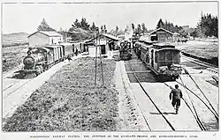 Historically, Morrinsville was the railway junction of the Auckland–Thames and Auckland–Rotorua lines, which subsequently became the Thames Branch and the East Coast Main Trunk Railway (Tauranga) lines. Morrinsville Railway Station was opened on 1 October 1884, to the east off Studholme Street, at the junction of the two lines. A footbridge over the track was opened in 1913, connecting the station with the town from the end of Canada Street.[40] The station was described as consisting of "two asphalt passenger platforms, and the station buildings contain a ladies' waiting room, a large general waiting room, a post office lobby with post and telegraph offices, a ticket office, and offices for the Inspector of Permanent Way. There are also large goods and engine sheds, and cattle loading yards. Five workmen's cottages adjoin the station, and the Bank of New Zealand Estates Company has a large building connected with the siding for seed-cleaning and storage purposes."[41] The station was moved about 1⁄4 mile (0.40 km) towards Hamilton in 1923.[42] The original station building was demolished in 1984 and a smaller building was erected approximately 300 metres to the west off Marshall Street, which is still used by KiwiRail for freight services.