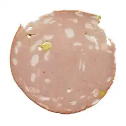 Mortadella[1] (Italian: [mortaˈdɛlla]) is a large salume made of finely hashed or ground cured pork, which incorporates at least 15% small cubes of pork fat (principally the hard fat from the neck of the pig). It is traditionally flavoured with peppercorns, but modern versions can also contain pistachios or, less commonly, myrtle berries. The sausage is then cooked.