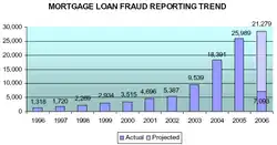 In 2004, the FBI warned that mortgage fraud was becoming so rampant that the resulting "epidemic" of crimes could trigger a massive financial crisis.[9] According to a December 2005 press release from the FBI, "mortgage fraud is one of the fastest growing white-collar crimes in the United States".[10] Between March 1 and June 18, 2008, 406 people were arrested for mortgage fraud in an FBI sting across the country. People arrested include buyers, sellers and others across the wide-ranging mortgage industry.[11]