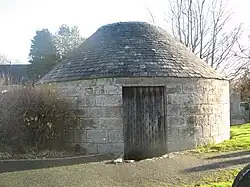 - Udny Green (NJ879264), Aberdeenshire – dating from 1832. A circular construction, rather than the usual rectangular, granite-built vault with a slate roof. A double-layered oak outer door studded with iron bolts and a keyhole protected by a hinged iron secured by a padlock. An iron sheet vertically sliding into a pair of grooves is an unusual feature. The circular wooden platform on which the coffins were laid revolves on a central stone pillar, and coffins were manoeuvred onto the platform that was then moved to make room for another coffin and so on.[9][31] There were four key holders, including the local minister.[10] It cost £114, covered by subscription.[10] No body was permitted to remain beyond three months.[10]