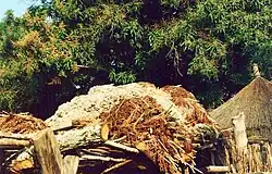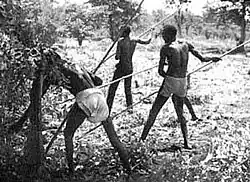 Contact with the wild bush is important, and many of the relishes are obtained from wild sources.[8][9] Hunting and fishing are important economic and social activities. Other wild foods include vegetables,[10] wild fruit, fungi and insects, especially termites. The bush is also the source of building materials, fuel and fibres. The traditional way of cultivation is for close relatives to cultivate together in one area. This is traditionally called a Kätiri, and is traditionally made of segments divided round a central marker such as a large tree or ant hill.[11]
