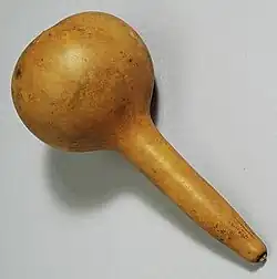 A rattle called gara is used by women in church or at dances. It is made from a small gourd that has been dried. It has a spherical body and narrow tapering neck with rounded end that serves as the instrument's handle. It is filled with a number of medium-sized seeds, normally okra, inserted through a circular hole cut into the centre of the top, and then resealed.[13]