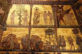 Most art historians now attribute the compositions to a number of Tuscan artists but their realisation to mosaicists from Venice or the eastern Mediterranean. Stylistic analogies with painted works enable links with the best 13th century masters, their collaborators, Giotto and the 'proto-Giottists' such as the so-called Last Master of the Baptistery identified by Roberto Longhi.[2] The works have been under almost constant restoration from the late 14th century onwards, with particularly notable schemes occurring in 1402, 1481, 1483–1499 (overseen by Alesso Baldovinetti, who was made "official restorer of the mosaic decoration"), 1781–1782 (general cleaning), 1821–1823 (dealing with serious damage in the area of Stories of Noah) and 1898–1907 (massive reintegration).[2]