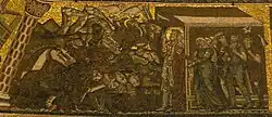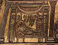 | Joseph Given Command over Egypt | It differs from the preceding scenes by a richer palette of colours, though this could be due to a different mosaicist, whilst its lively composition in almost pathetic tones may attribute them to the Master of the Maddalena (Pesenti, 1978–1979). | |