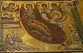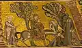 Noah and the Animals Enter the Ark | Double scene, showing a certain modernity in the animals. Ponticelli attributed it to a 1483–1499 intervention by Alesso Baldovinetti, inspired by Paolo Uccello's frescoes Scenes from the Life of Noah in the Chiostro Verde of Santa Maria Novella. Roberto Longhi instead argued the mosaic was earlier than the fresco, with the latter drawing on the former. Soulier noted Egyptian or Syriac influence. |