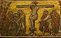 The three segments above the altar show the Last Judgement, with the centre almost completely filled by a figure of Christ the Judge seated on the Circles of Paradise and holding out his hands, showing his wounds from the Crucifixion, one facing palm up and the other palm down, directing souls to heaven and hell respectively. The large feet also show the wounds from the Crucifixion – their staggered pose, the robe's complex pleats and the side view of the legs avoid a rigid frontal effect, highlighted with golden tesserae. The cruciform halo includes mirror-like enamel cubes, also included in the border of the mandorla around Christ. Either side of the mandorla are three parallel registers, with two almost symmetrical hosts of angels at the top bearing symbols of Christ's passion and attributes of the Judgement, along with two angels sounding the last trumpet of the Apocalypse summoning the dead from their graves at Christ's feet.